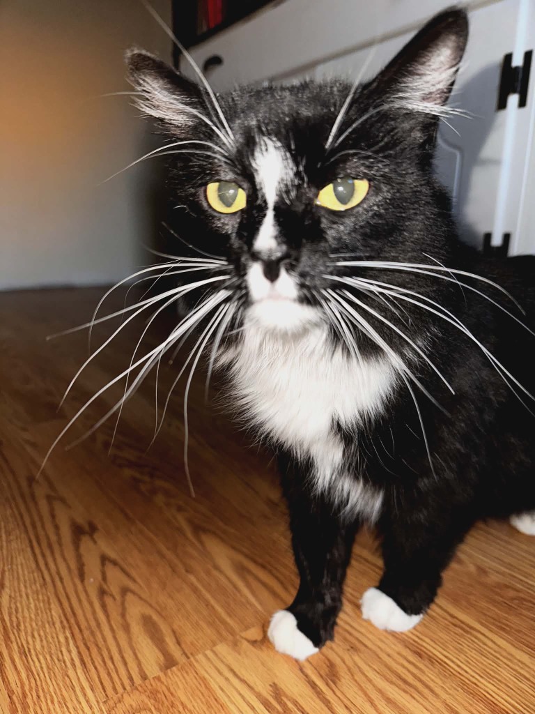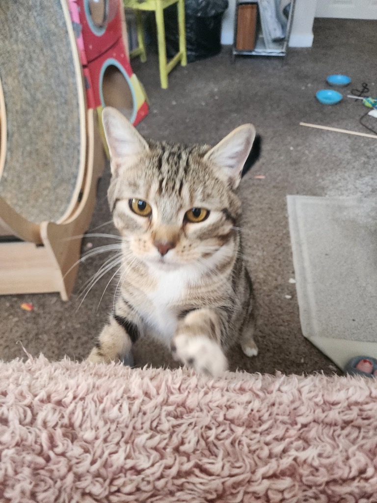 Chaos is a bit skittish, but loves attention and getting underfoot. He loves snuggling when he comes to you. Chaos likes feathers and will pick up and carry small bells. He enjoys biting small teddy bears. Chaos will try to play with other cats even if they don't want to.