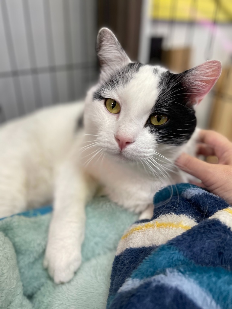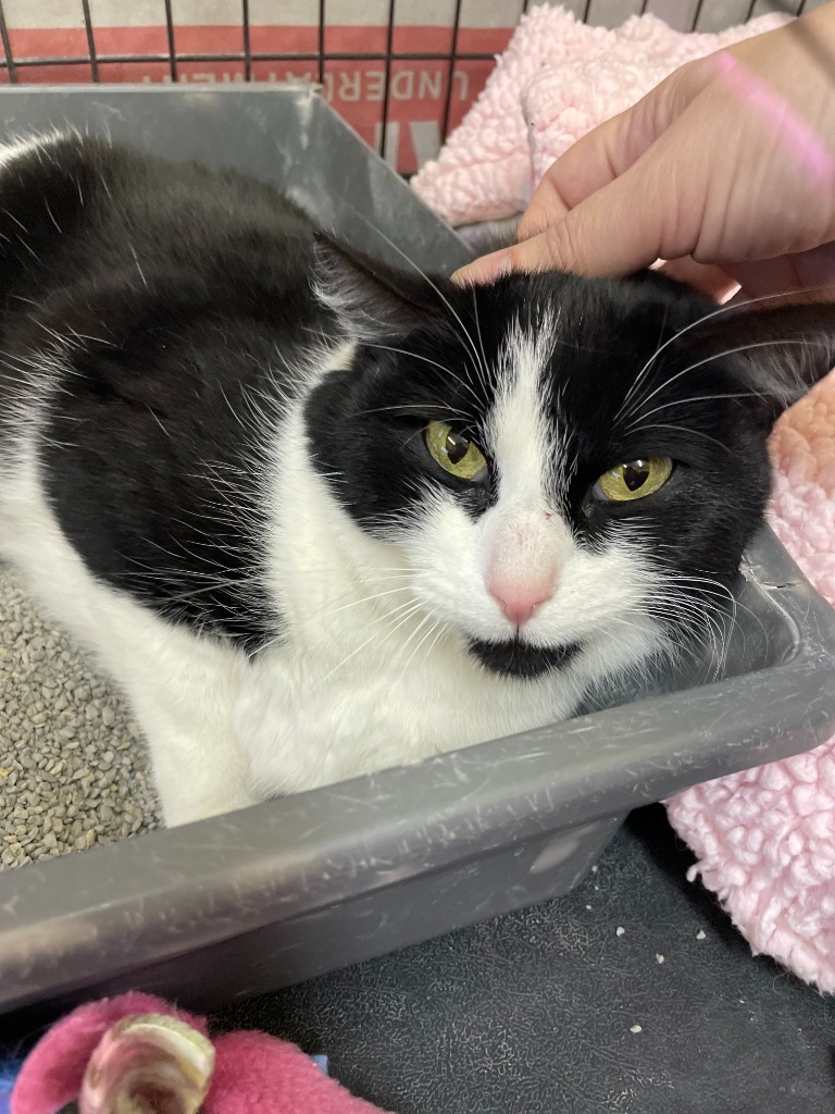 Baby is a pretty black and white kitty who came to us when her owner could no longer care for her. She is a little shy at first, but then is very loving and sweet. Baby loves to be petted. Her former owner said that she got along with the other cats, the dogs and the kids in her previous home.